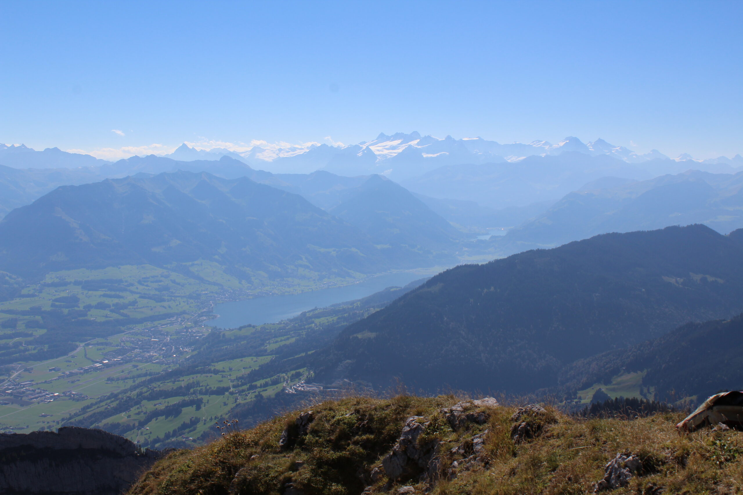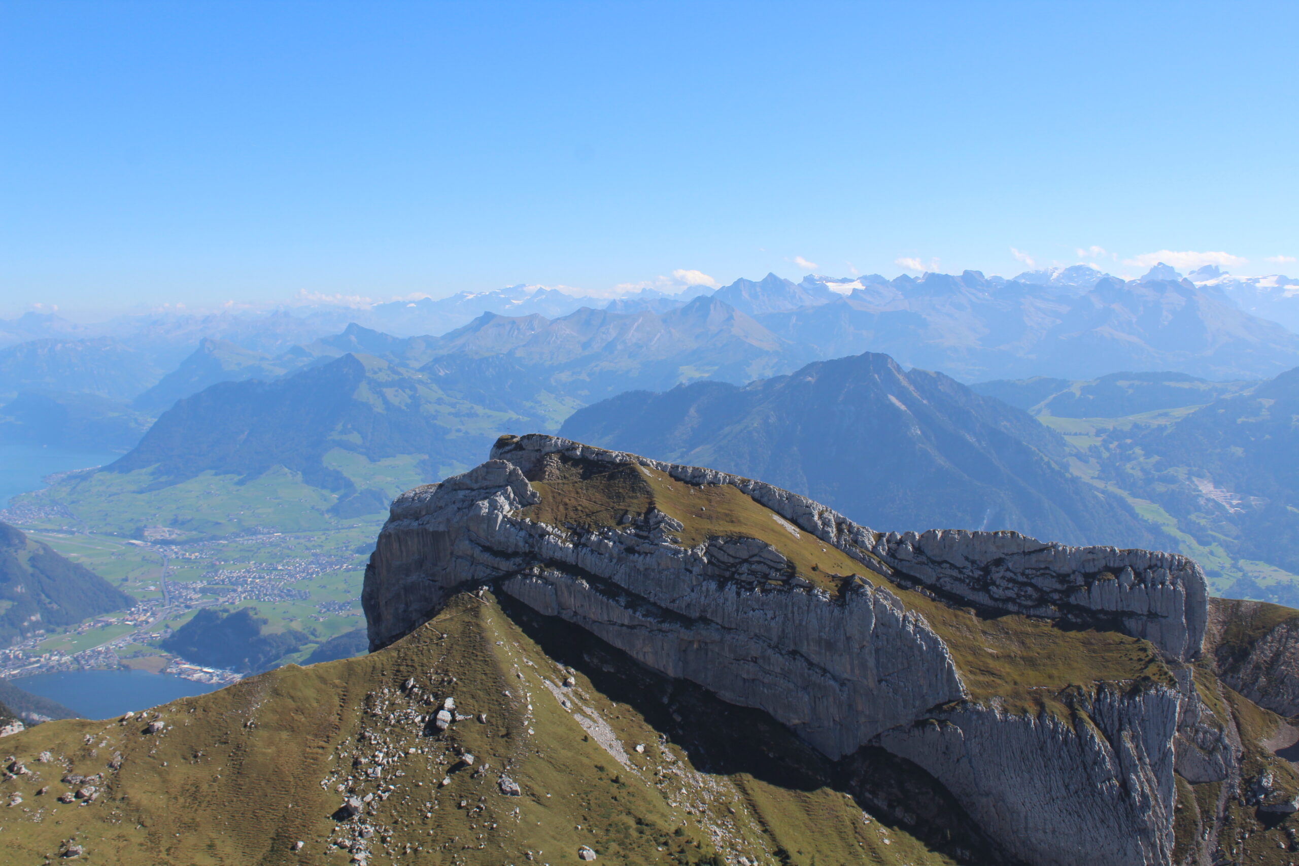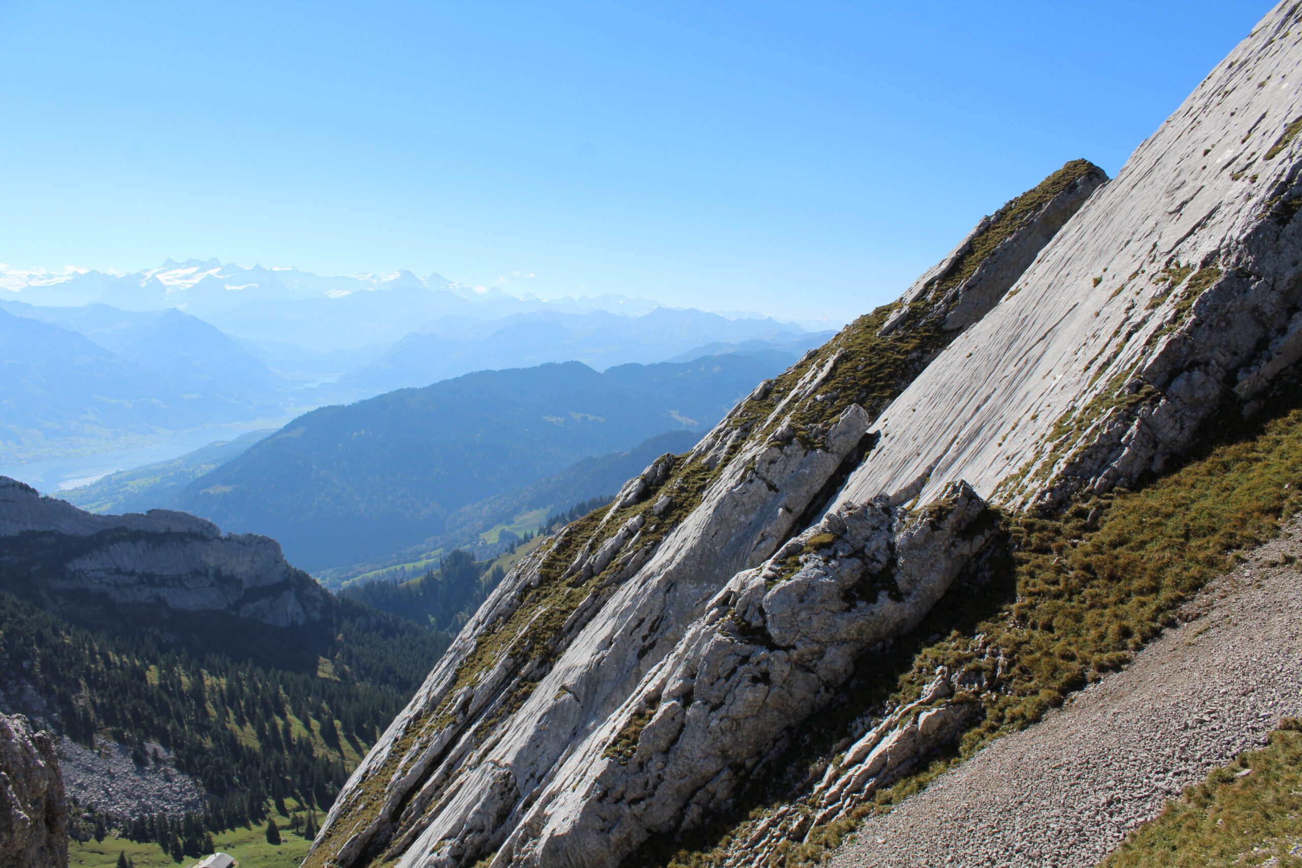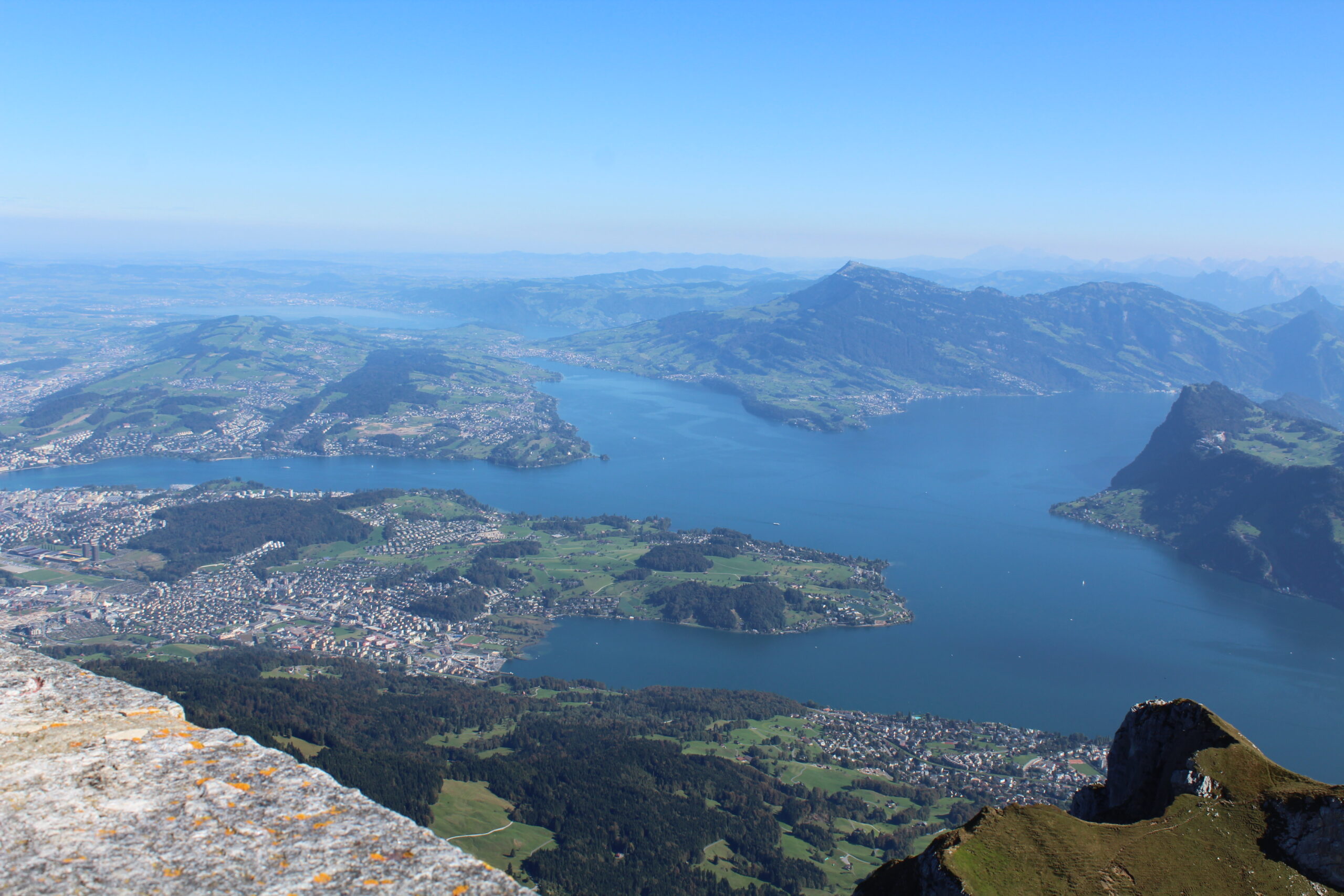 After chatting with some nice people at tourist information we purchased all the tickets we would need to navigate to Mount Pilatus. This would involve getting on a train from Lucerne to Alpnachstad. From there you get off the train, show your ticket to some friendly people and they give you another ticket to board the super steep train that goes straight up the mountain at a terrifying angle. Jacob tells me this is the steepest train in the world. The steepest angle is 48 percent. We were in the car with a German family and two men traveling from India. The father of the German family was so kind to swap seats with me so that I could take pictures out of the window, which was a bit terrifying but also awesome.