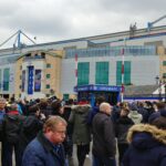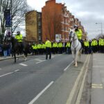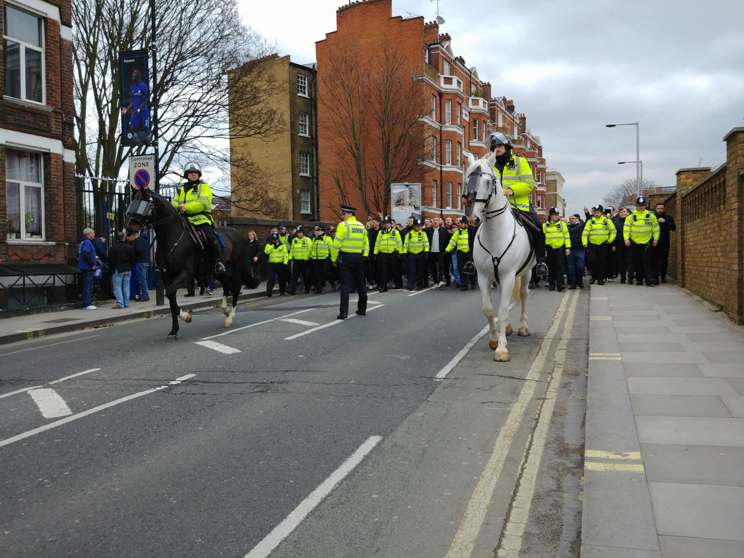 We both were exhausted and decided to take a short nap before heading out the door to explore the city. We first walked to the Chelsea football stadium since a game was beginning soon. The crowds were huge and we got to witness the opposing team fans marching in and singing a song that didn’t say any kind things about the Chelsea team. They had a police escort too, with horses! (photos below – click to enlarge)