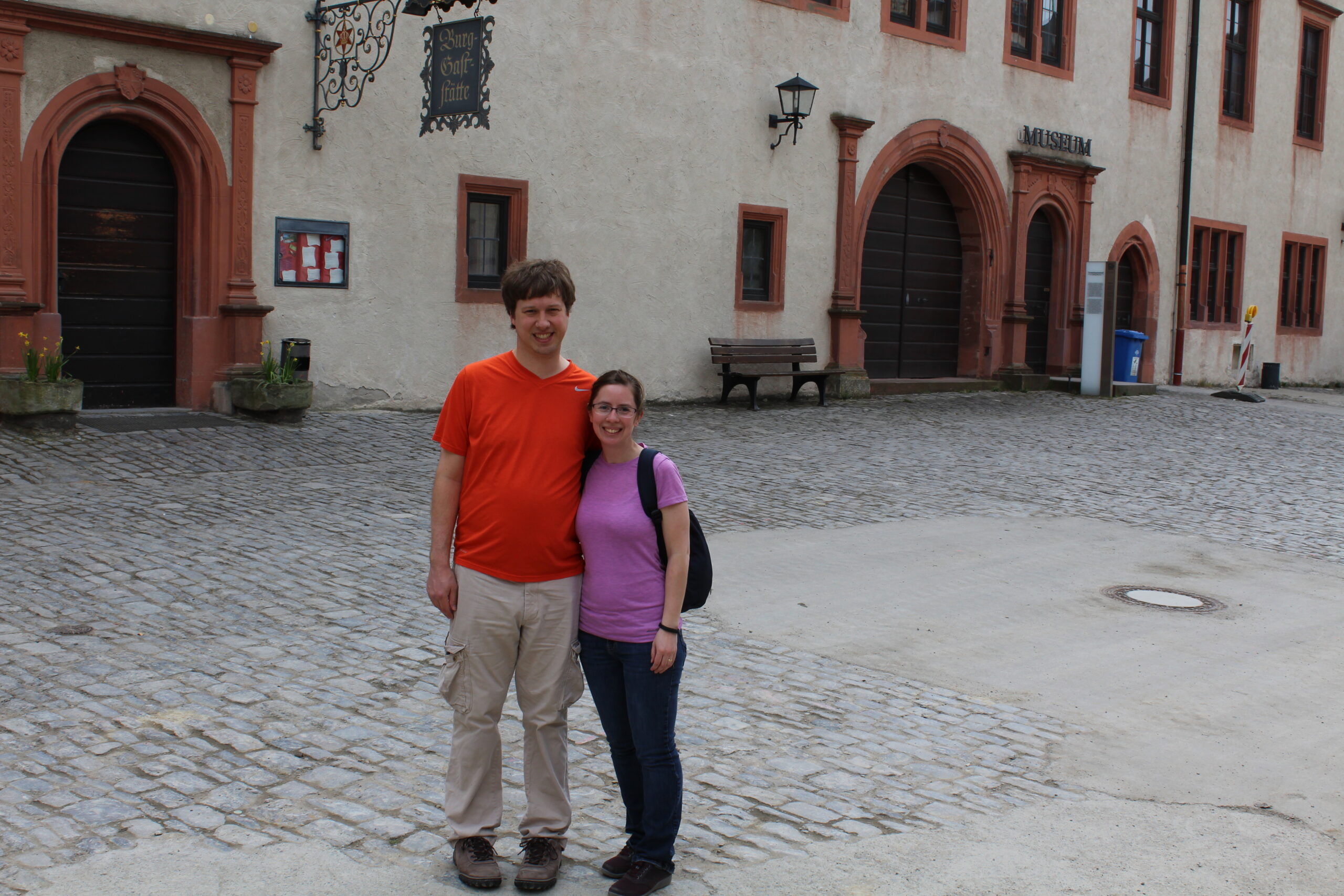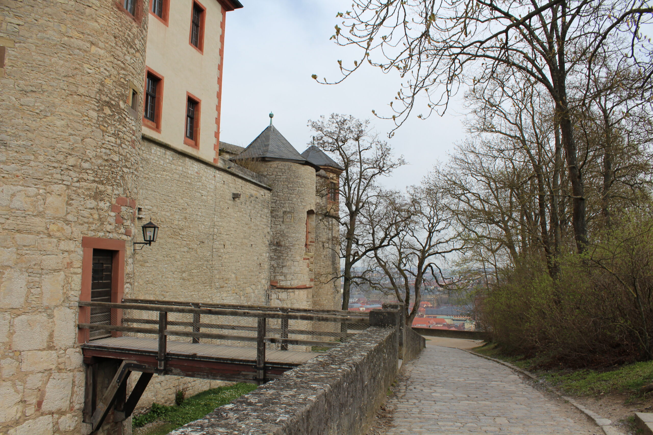 We walked from the Residence across the Alte Mainbrucke (a bridge built 1473-1543). This bridge was damaged during World War II but restored. Along the bridge are 12 statues of saints and historically significant people. When we were on the bridge Jacob asked if I wanted to walk up to the Marienberg Fortress. I said of course! And he said, he just wasn’t sure my little legs were up to it. Below is the fortress from the bridge.