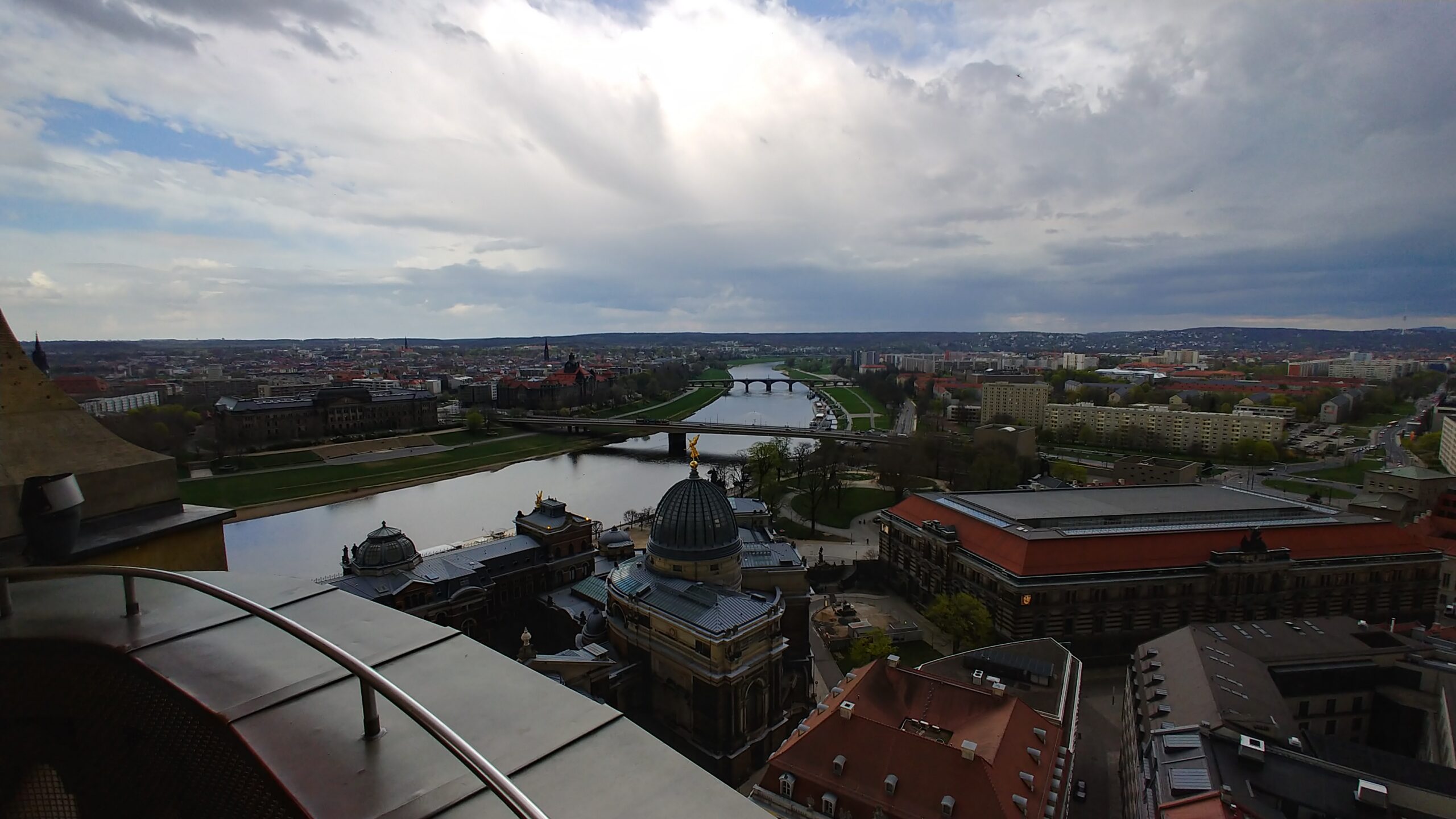 Since the sun was out we decided to book it back to the apartment and grab my camera so we could go up to the top of the Frauenkirche and take some photos. Our new museum cards give us some discounts around town so we were able to use them here. We took an elevator, then some stairs, then a long ramp, then a ladder/like staircase then more stairs and made it to the top. We could see the rain clouds in the distance and within a few minutes it was raining all around us.