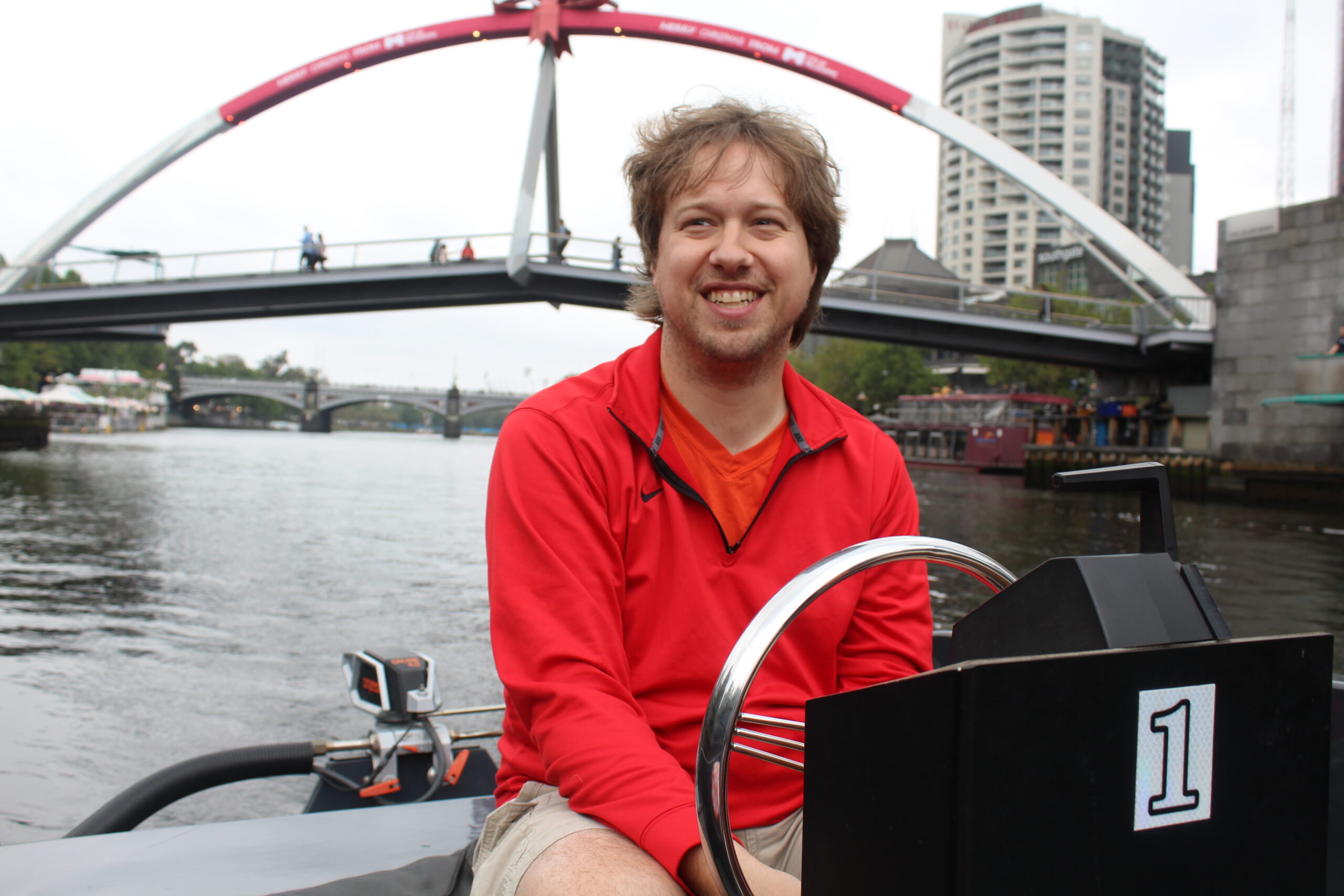 We reserved our boat for 4 p.m. and arrived just on time. The staff member at the boat dock had an interesting accent I couldn’t place. He asked where were traveling from and we said the United States. He mentioned that it wasn’t the best summer day in Melbourne and we said it was still better than the weather back home. He said that was the same for him and that he was from the Netherlands. So he had an Australian-Dutch accent. That made sense! He was very friendly and helpful and explained to us how to drive the boat. He also recommended that we stop on Herring Island. This is the only island on the Yarra River.