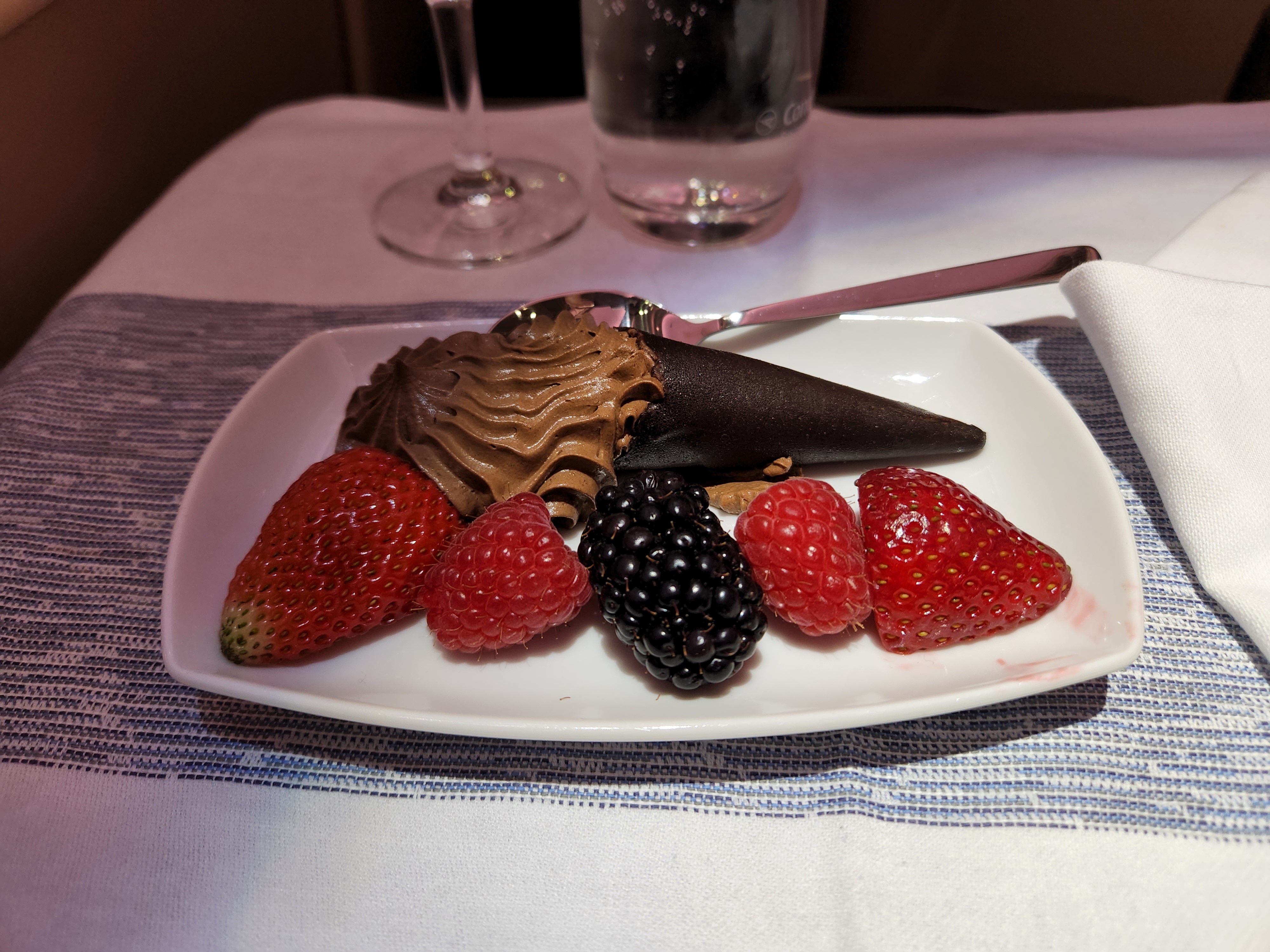 We were fed dinner shortly after boarding. We were fed breakfast around 3 a.m., or about an hour before we landed. Highlight of the flight was definitely the dessert and free wine.